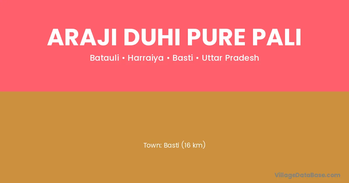 Basti (16 km) is the nearest town to Araji Duhi Pure Pali village for major economic activities and is located approximately 16 km away.