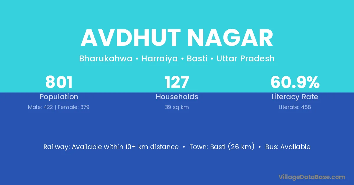 Basti (26 km) is the nearest town to Avdhut Nagar village for major economic activities and is located approximately 26 km away.