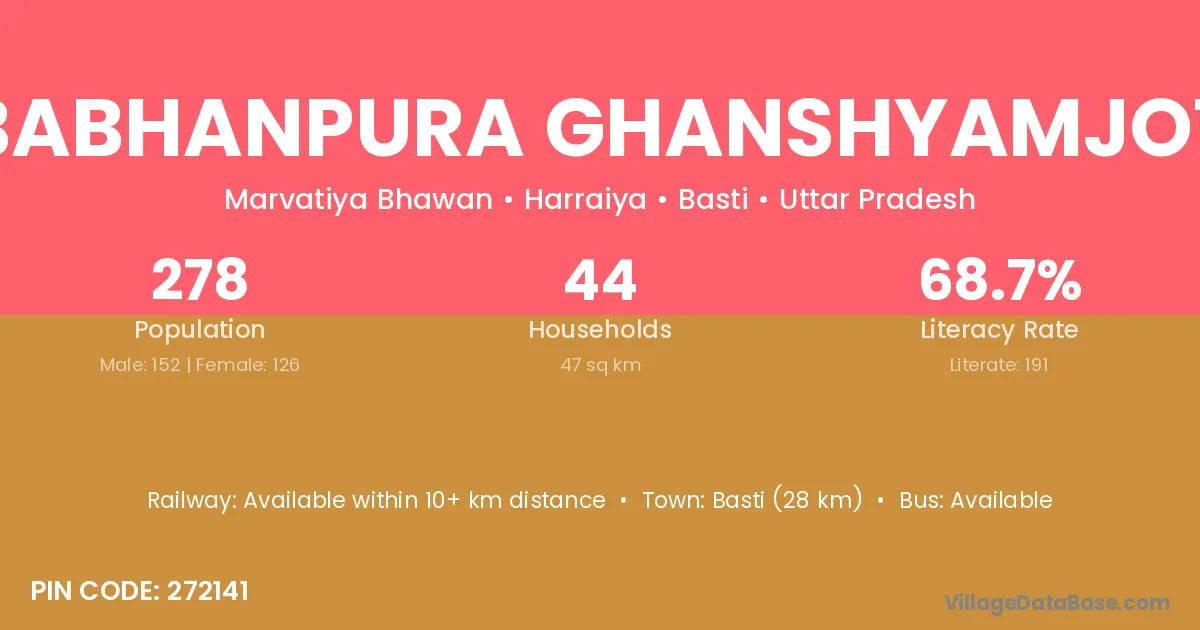 Basti (28 km) is the nearest town to Babhanpura Ghanshyamjot village for major economic activities and is located approximately 28 km away.