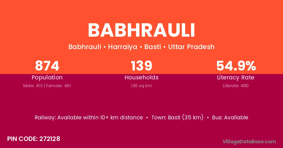 Basti (35 km) is the nearest town to Babhrauli village for major economic activities and is located approximately 35 km away.