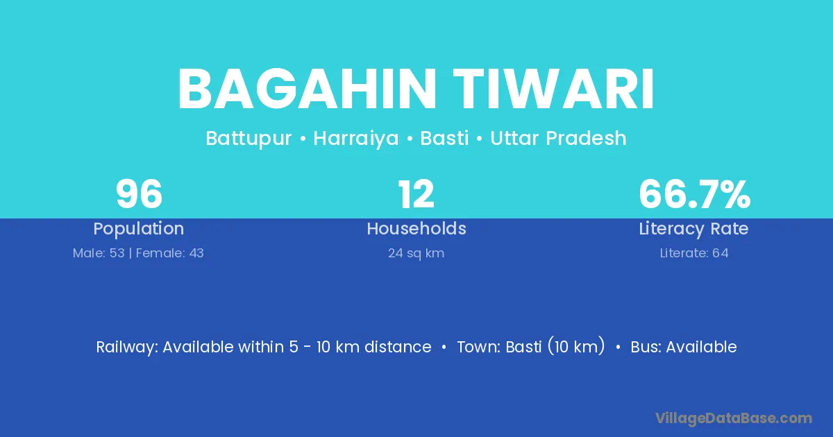 Basti (10 km) is the nearest town to Bagahin Tiwari village for major economic activities and is located approximately 10 km away.