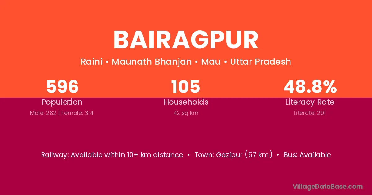 The literacy rate of Bairagpur village is 56.11%. Male literacy stands at 64.03% and female literacy at 47.88%.