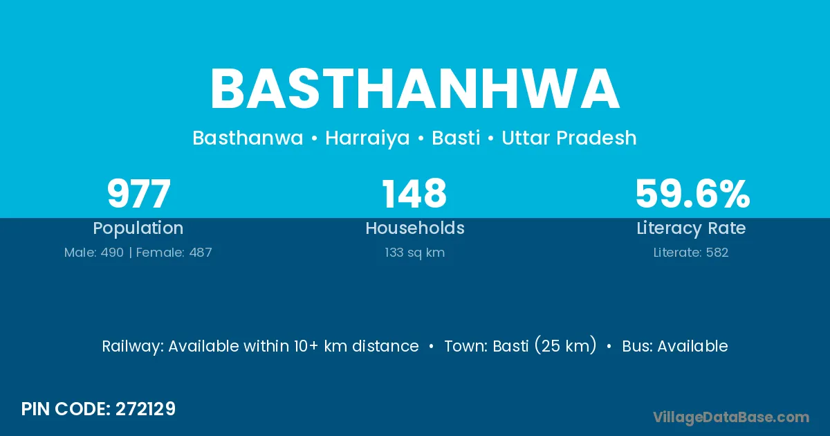 Basti (25 km) is the nearest town to Basthanhwa village for major economic activities and is located approximately 25 km away.