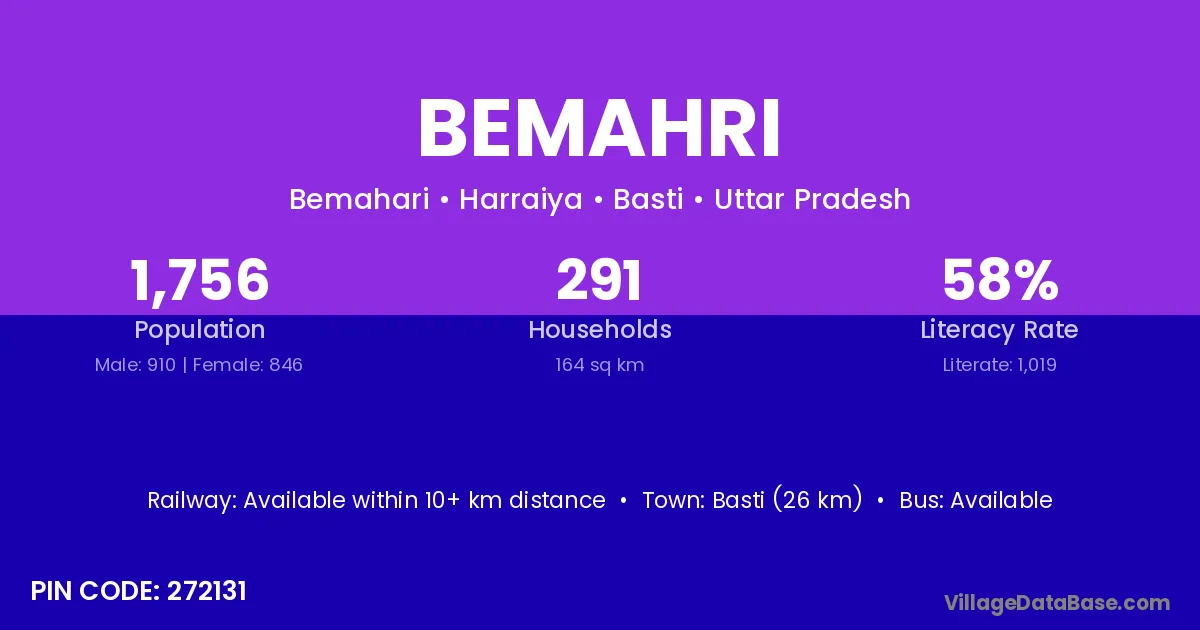 Basti (26 km) is the nearest town to Bemahri village for major economic activities and is located approximately 26 km away.
