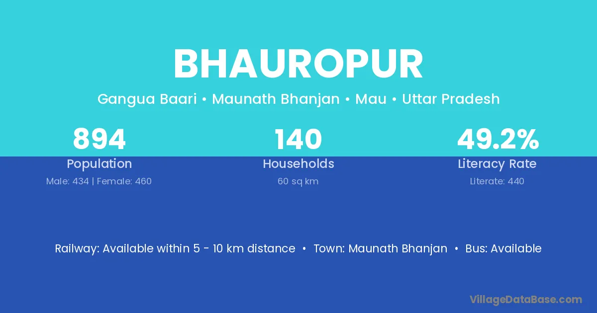 The literacy rate of Bhauropur village is 57.54%. Male literacy stands at 71.43% and female literacy at 45.67%.