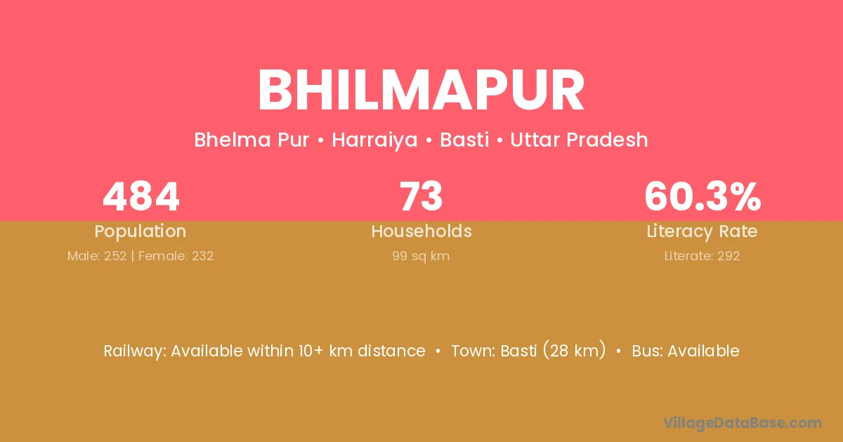 Basti (28 km) is the nearest town to Bhilmapur village for major economic activities and is located approximately 28 km away.