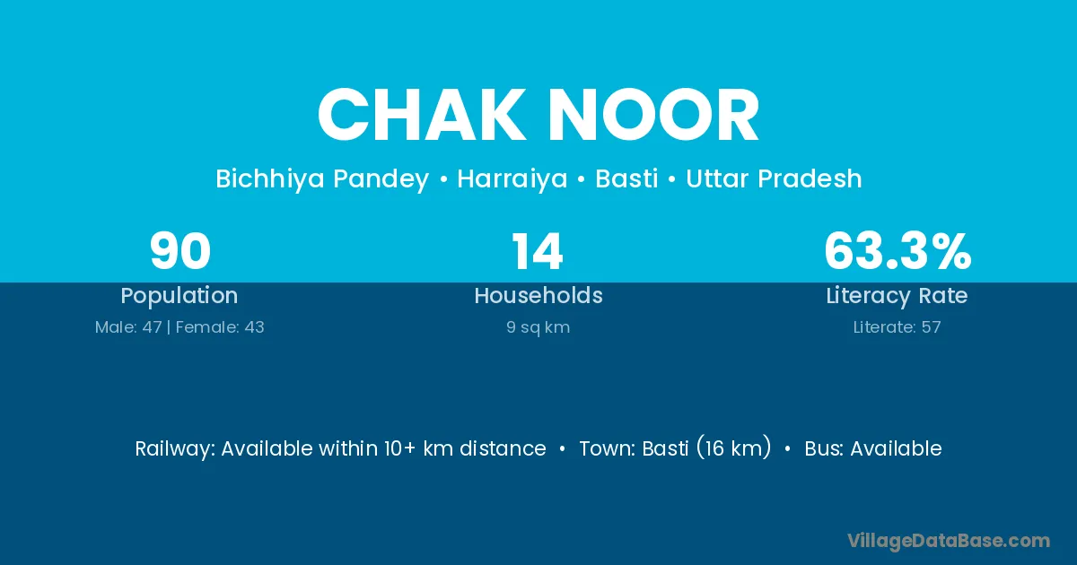 Basti (16 km) is the nearest town to Chak Noor village for major economic activities and is located approximately 16 km away.