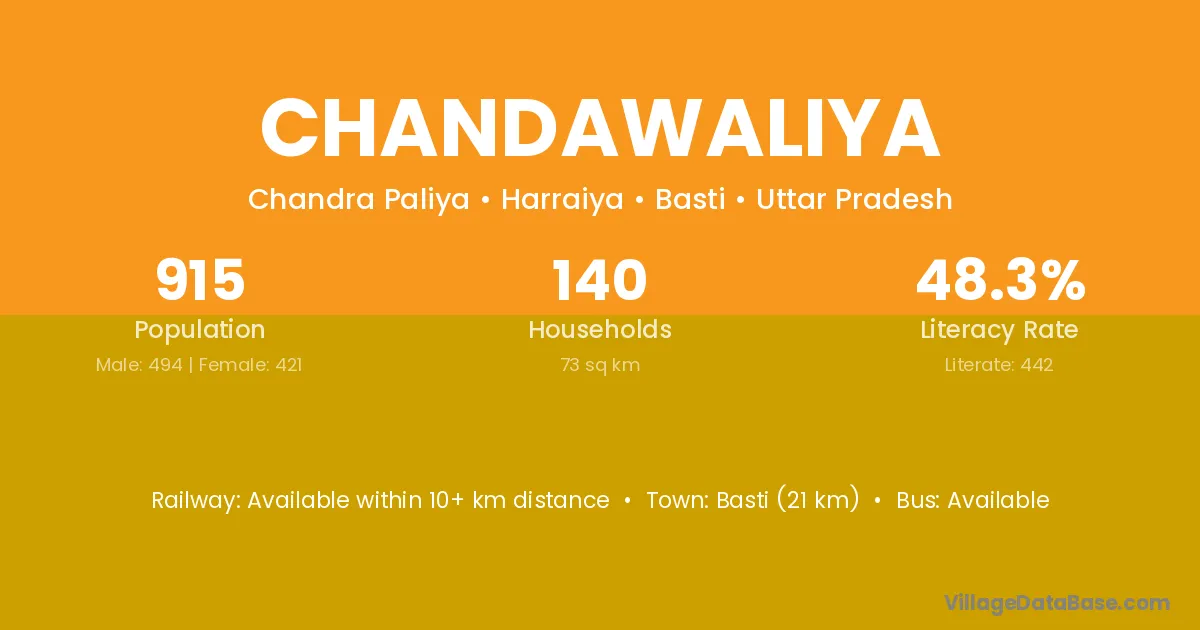 Chandawaliya village has a total population of 915 people, of which 494 are males and 421 are females.