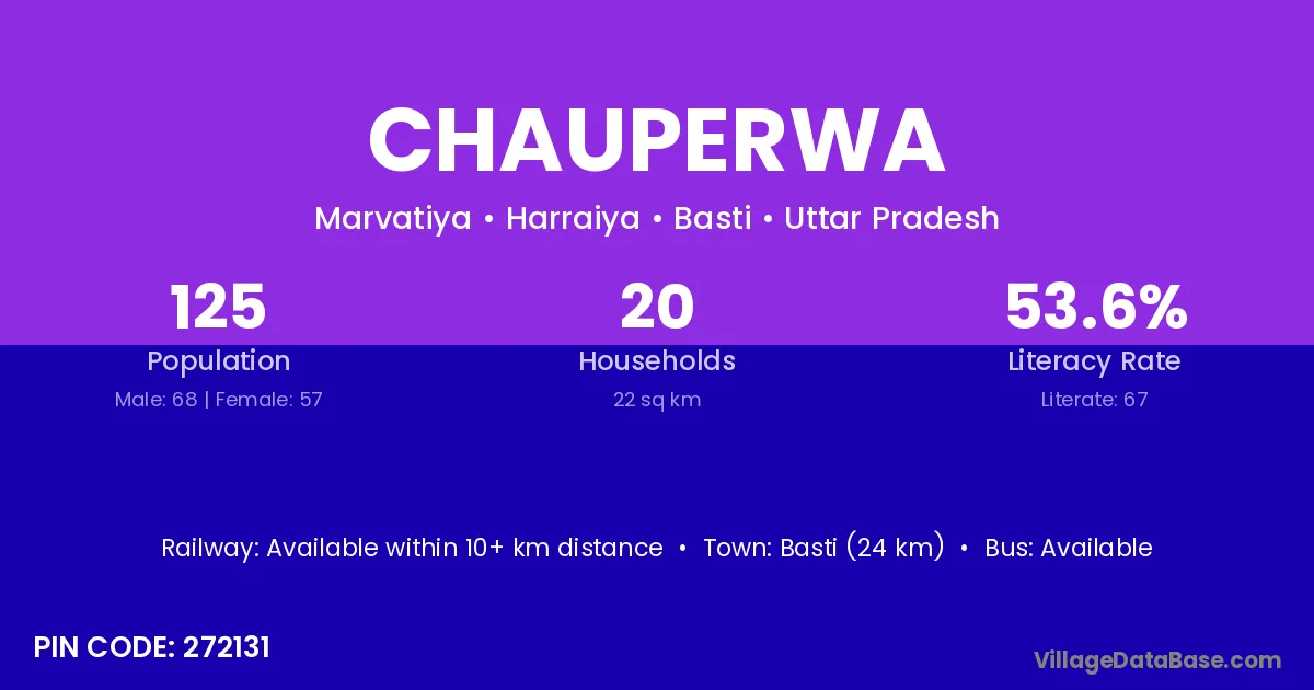 Basti (24 km) is the nearest town to Chauperwa village for major economic activities and is located approximately 24 km away.
