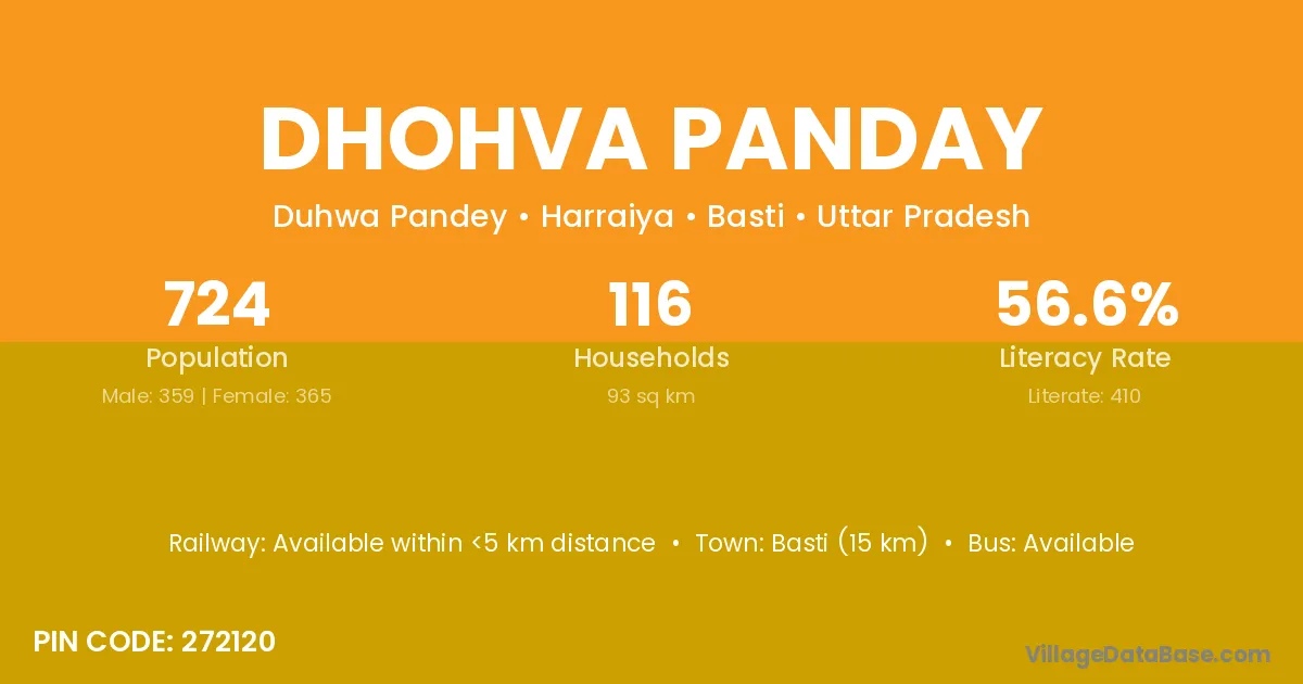 Basti (15 km) is the nearest town to Dhohva Panday village for major economic activities and is located approximately 15 km away.