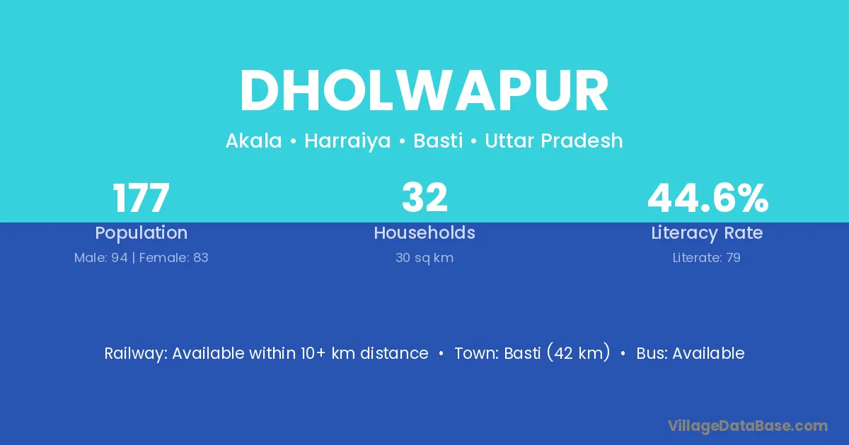 Basti (42 km) is the nearest town to Dholwapur village for major economic activities and is located approximately 42 km away.