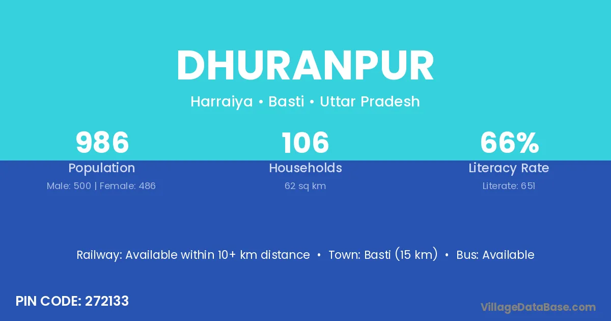 Basti (15 km) is the nearest town to Dhuranpur village for major economic activities and is located approximately 15 km away.