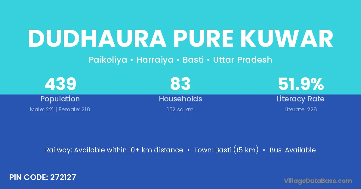Dudhaura Pure Kuwar village has a total population of 439 people, of which 221 are males and 218 are females.
