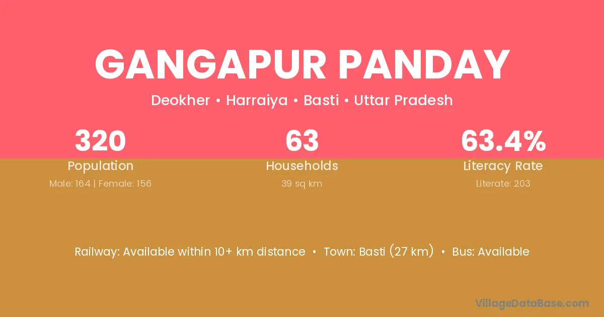 Basti (27 km) is the nearest town to Gangapur Panday village for major economic activities and is located approximately 27 km away.