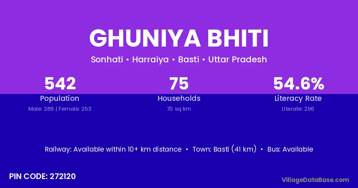 Basti (41 km) is the nearest town to Ghuniya Bhiti village for major economic activities and is located approximately 41 km away.