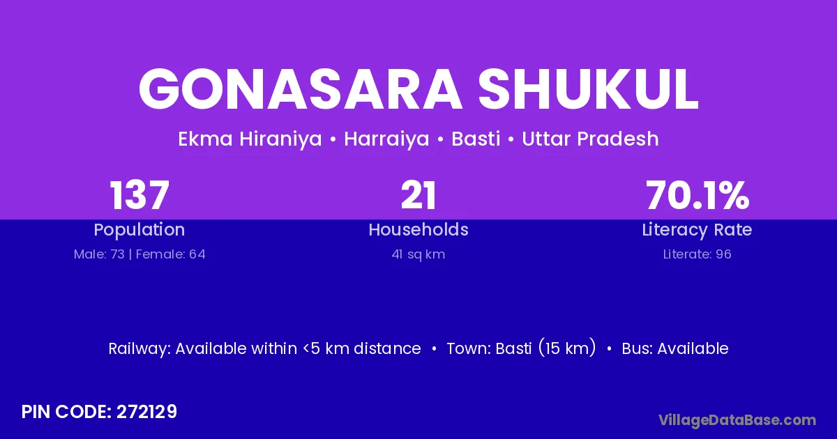 Basti (15 km) is the nearest town to Gonasara Shukul village for major economic activities and is located approximately 15 km away.