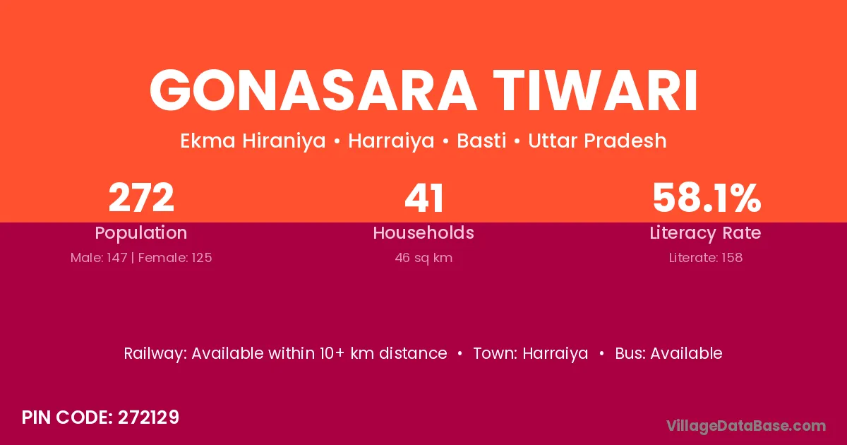 Gonasara Tiwari village has a total population of 272 people, of which 147 are males and 125 are females.