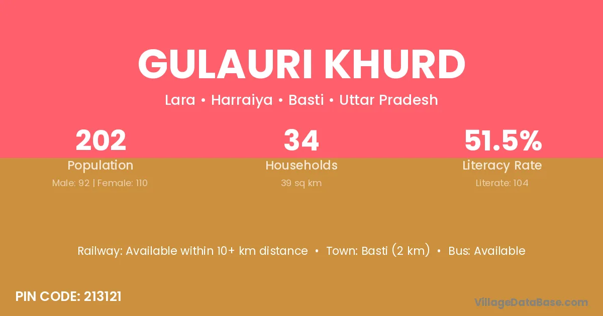 Basti (2 km) is the nearest town to Gulauri Khurd village for major economic activities and is located approximately 2 km away.