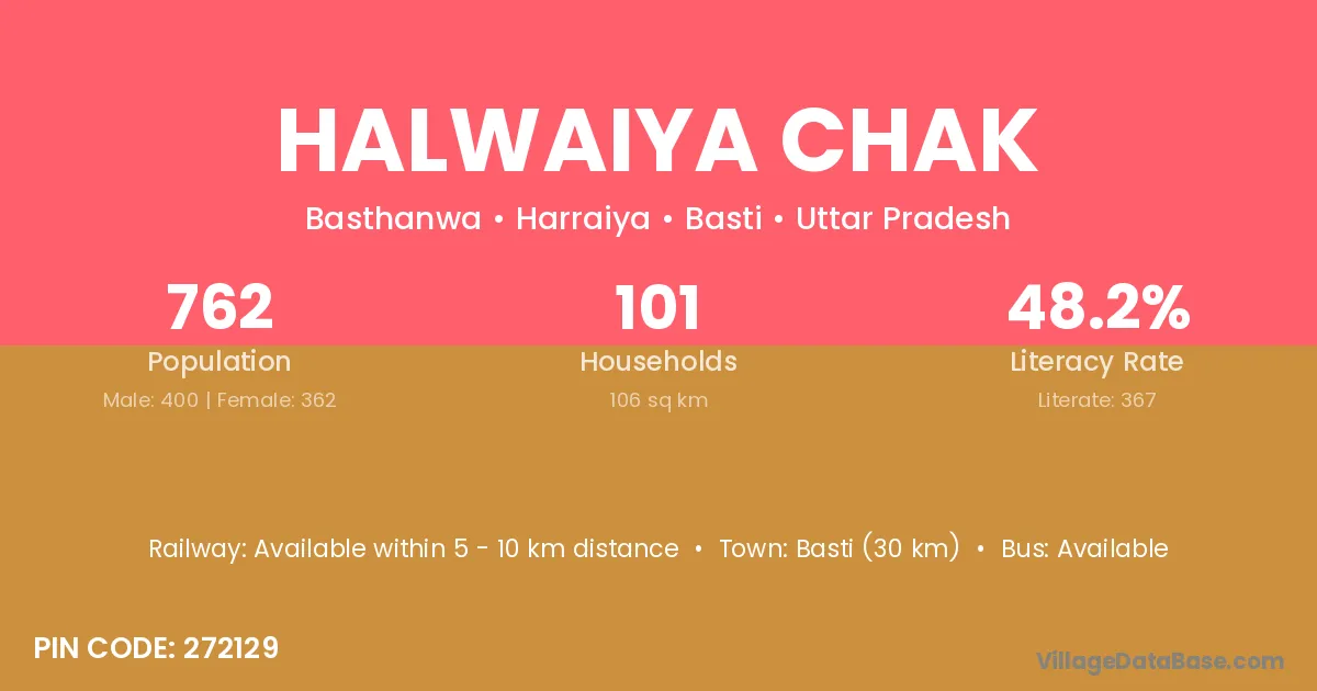 Basti (30 km) is the nearest town to Halwaiya Chak village for major economic activities and is located approximately 30 km away.