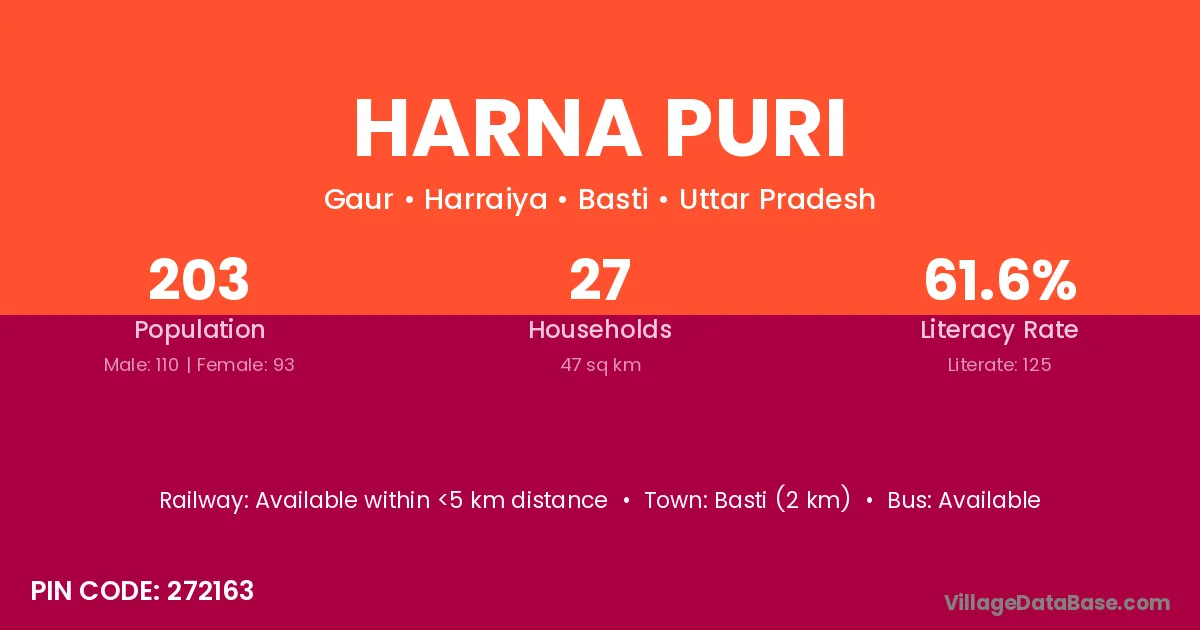 Basti (2 km) is the nearest town to Harna Puri village for major economic activities and is located approximately 2 km away.