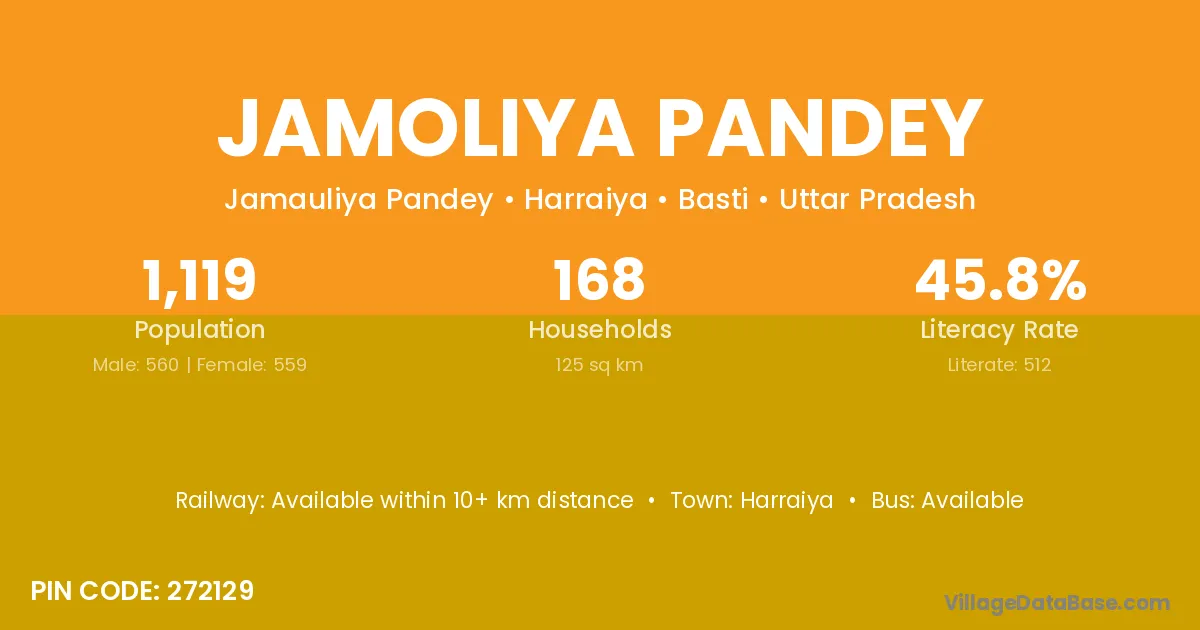 Jamoliya Pandey village has a total population of 1,119 people, of which 560 are males and 559 are females.