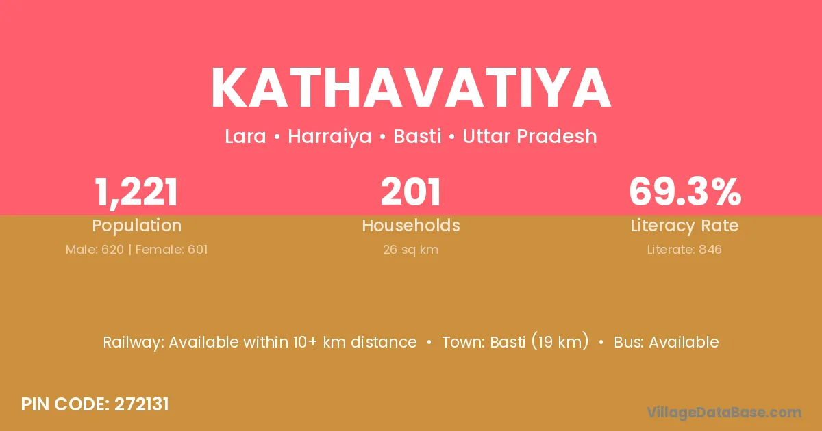 Basti (19 km) is the nearest town to Kathavatiya village for major economic activities and is located approximately 19 km away.