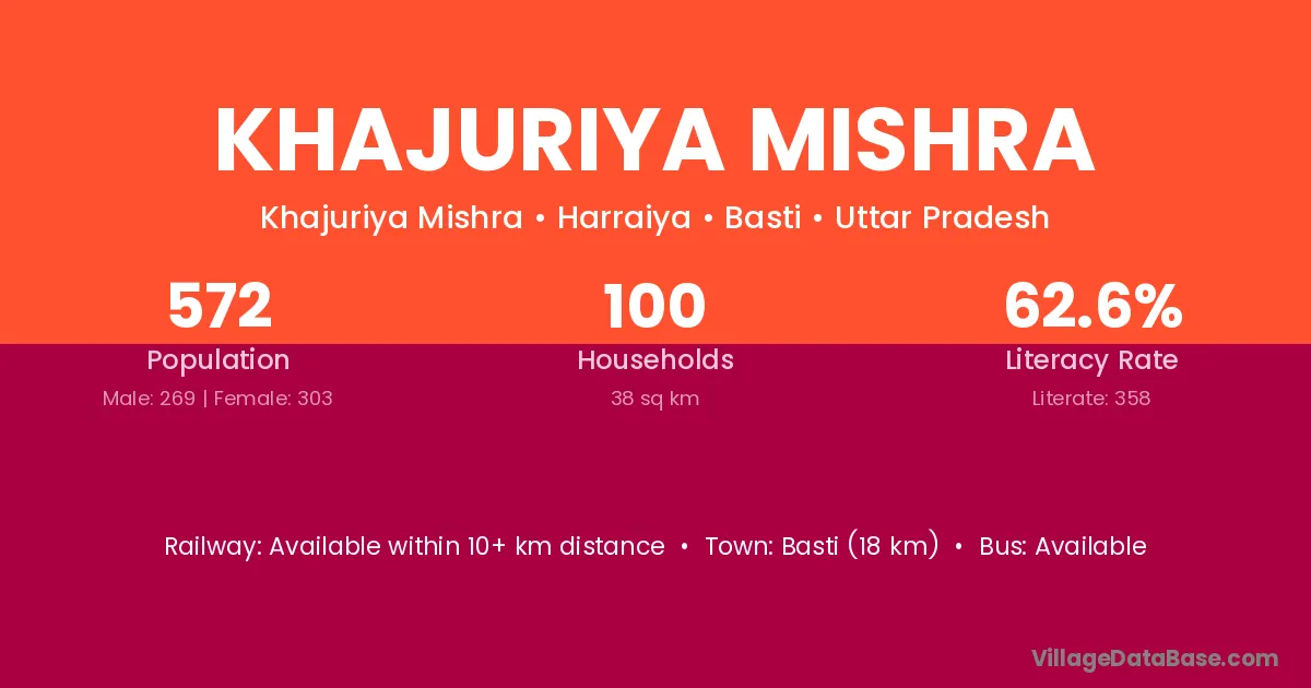 Basti (18 km) is the nearest town to Khajuriya Mishra village for major economic activities and is located approximately 18 km away.