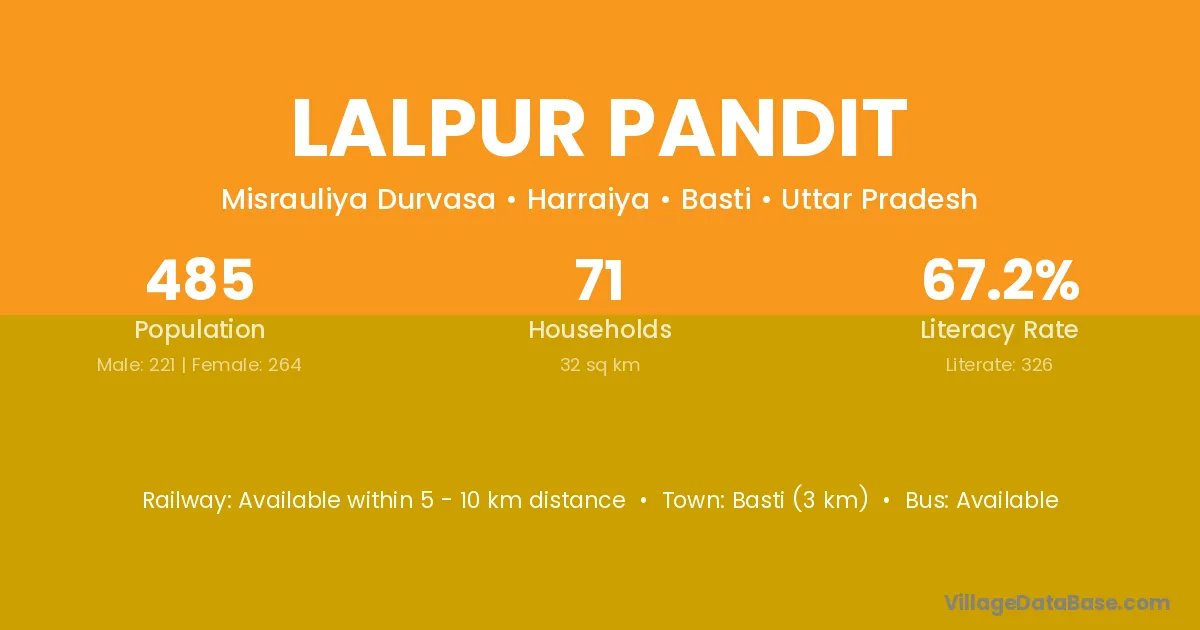 Lalpur Pandit village has a total population of 485 people, of which 221 are males and 264 are females.