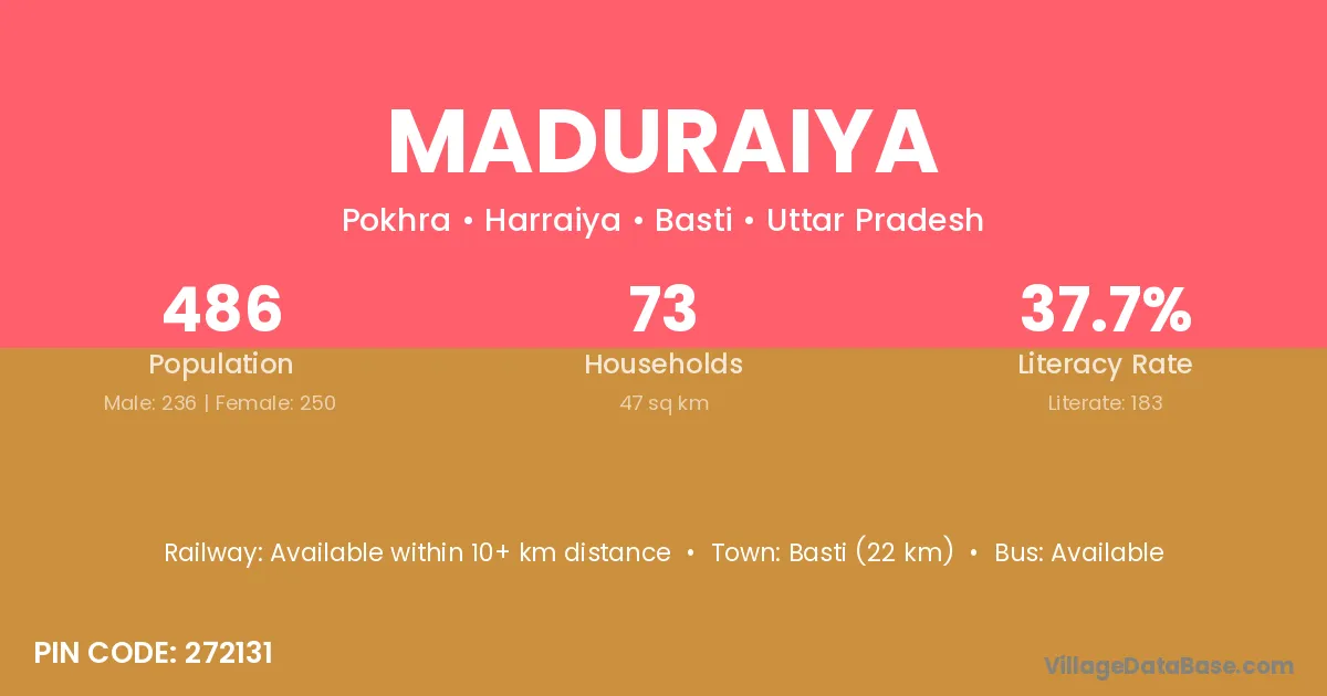 Basti (22 km) is the nearest town to Maduraiya village for major economic activities and is located approximately 22 km away.