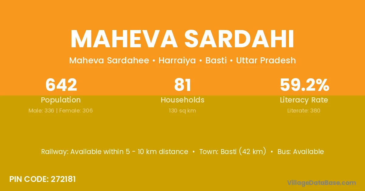 Basti (42 km) is the nearest town to Maheva Sardahi village for major economic activities and is located approximately 42 km away.