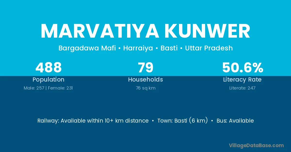 Basti (6 km) is the nearest town to Marvatiya Kunwer village for major economic activities and is located approximately 6 km away.