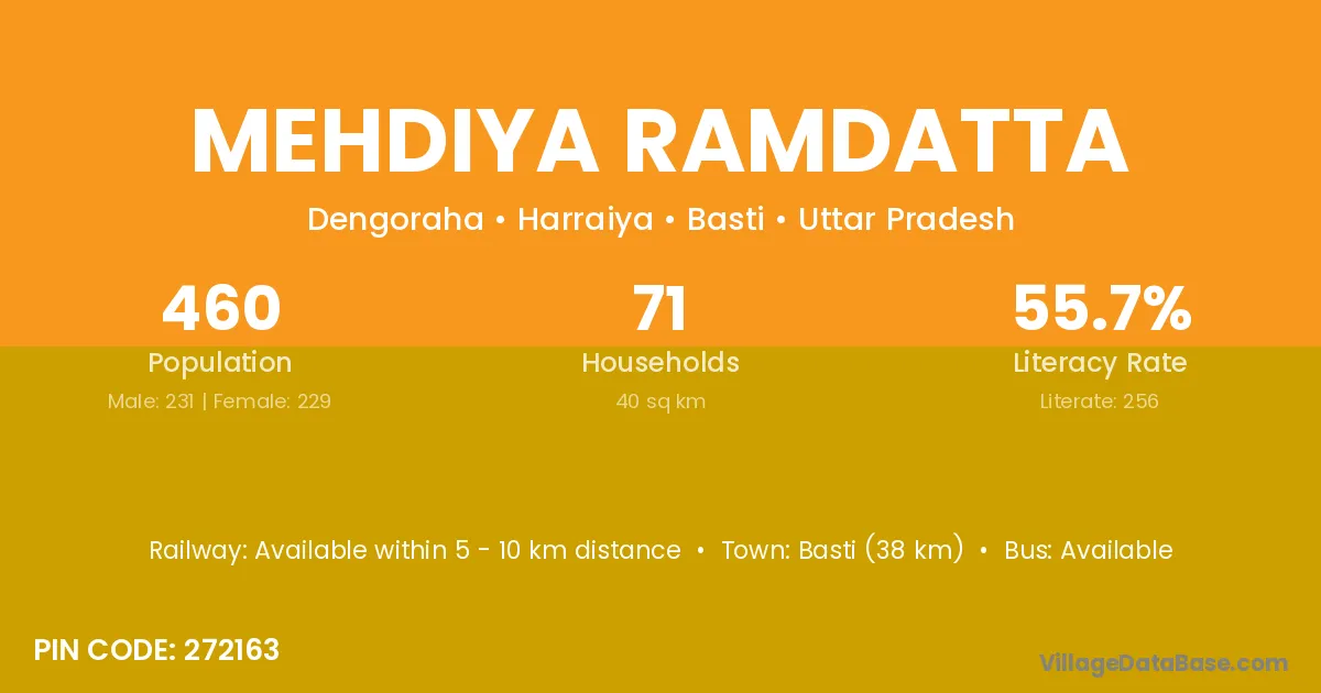 Mehdiya Ramdatta village has a total population of 460 people, of which 231 are males and 229 are females.