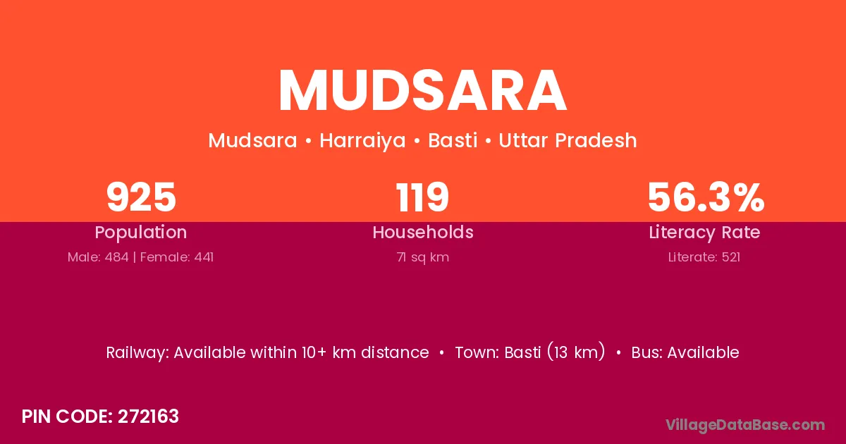 Basti (13 km) is the nearest town to Mudsara village for major economic activities and is located approximately 13 km away.