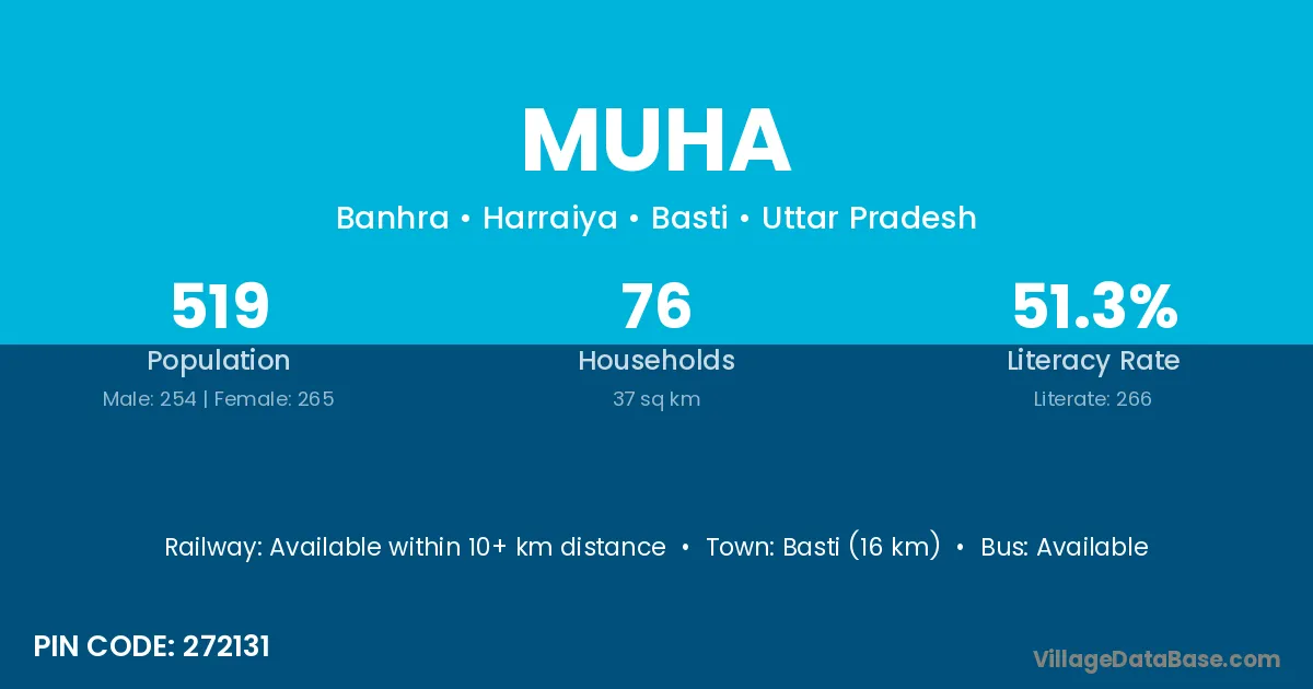 Basti (16 km) is the nearest town to Muha village for major economic activities and is located approximately 16 km away.