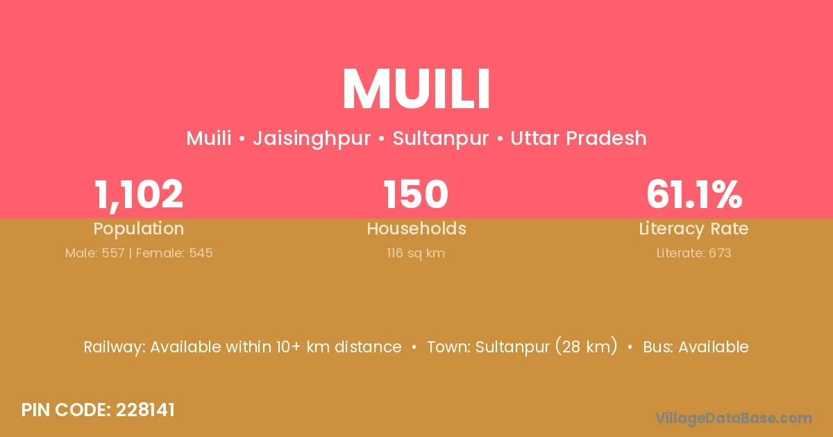 The literacy rate of Muili village is 42.00%. Male literacy stands at 50.96% and female literacy at 31.89%.