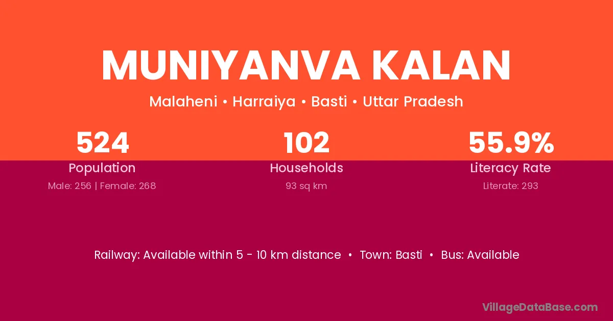 Muniyanva Kalan village has a total population of 524 people, of which 256 are males and 268 are females.