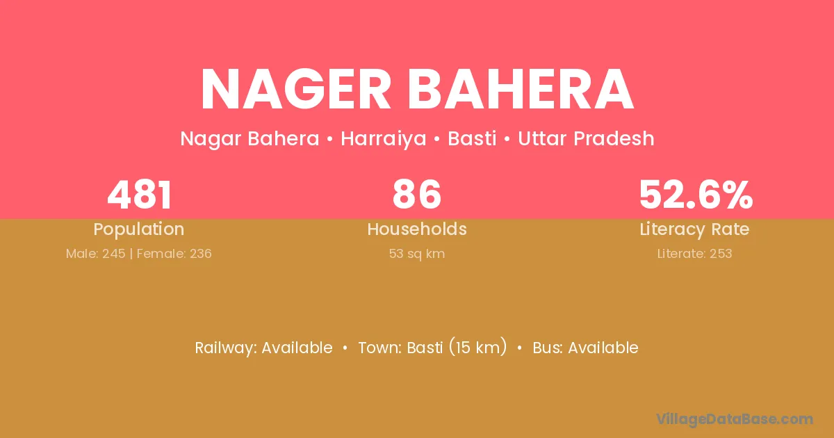 Basti (15 km) is the nearest town to Nager Bahera village for major economic activities and is located approximately 15 km away.