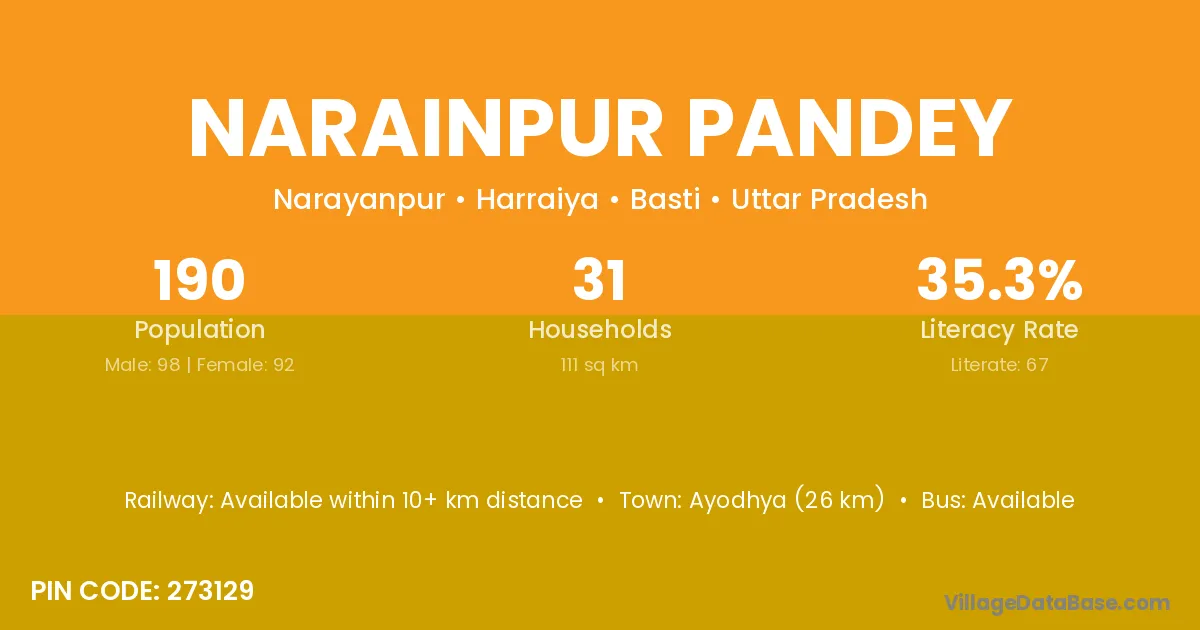 Ayodhya (26 km) is the nearest town to Narainpur Pandey village for major economic activities and is located approximately 26 km away.