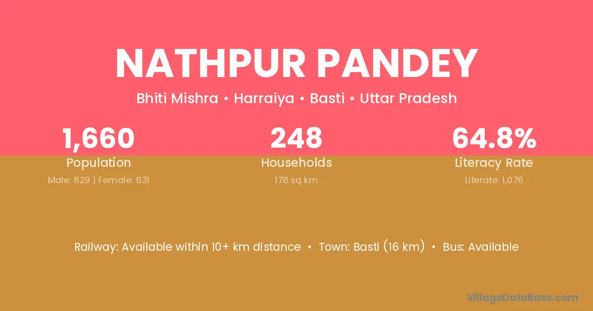 Basti (16 km) is the nearest town to Nathpur Pandey village for major economic activities and is located approximately 16 km away.