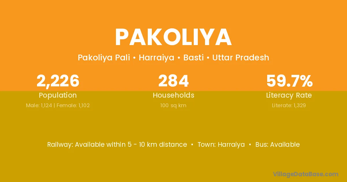 Pakoliya village has a total population of 2,226 people, of which 1,124 are males and 1,102 are females.