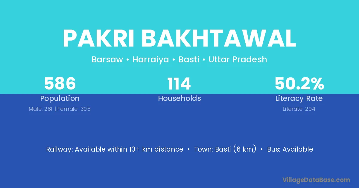 Basti (6 km) is the nearest town to Pakri Bakhtawal village for major economic activities and is located approximately 6 km away.