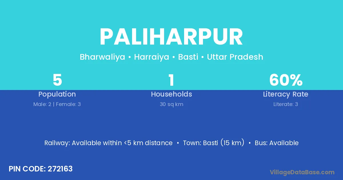 Basti (15 km) is the nearest town to Paliharpur village for major economic activities and is located approximately 15 km away.