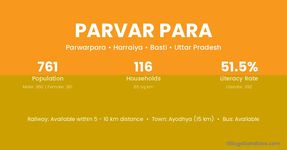 Ayodhya (15 km) is the nearest town to Parvar Para village for major economic activities and is located approximately 15 km away.