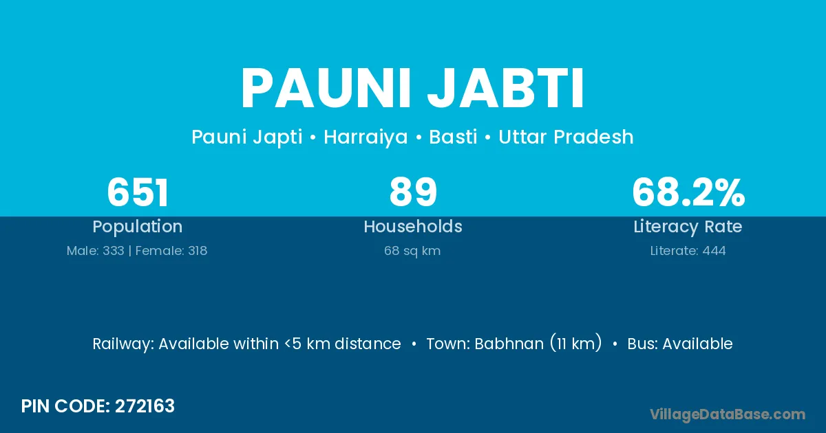 Babhnan (11 km) is the nearest town to Pauni Jabti village for major economic activities and is located approximately 11 km away.