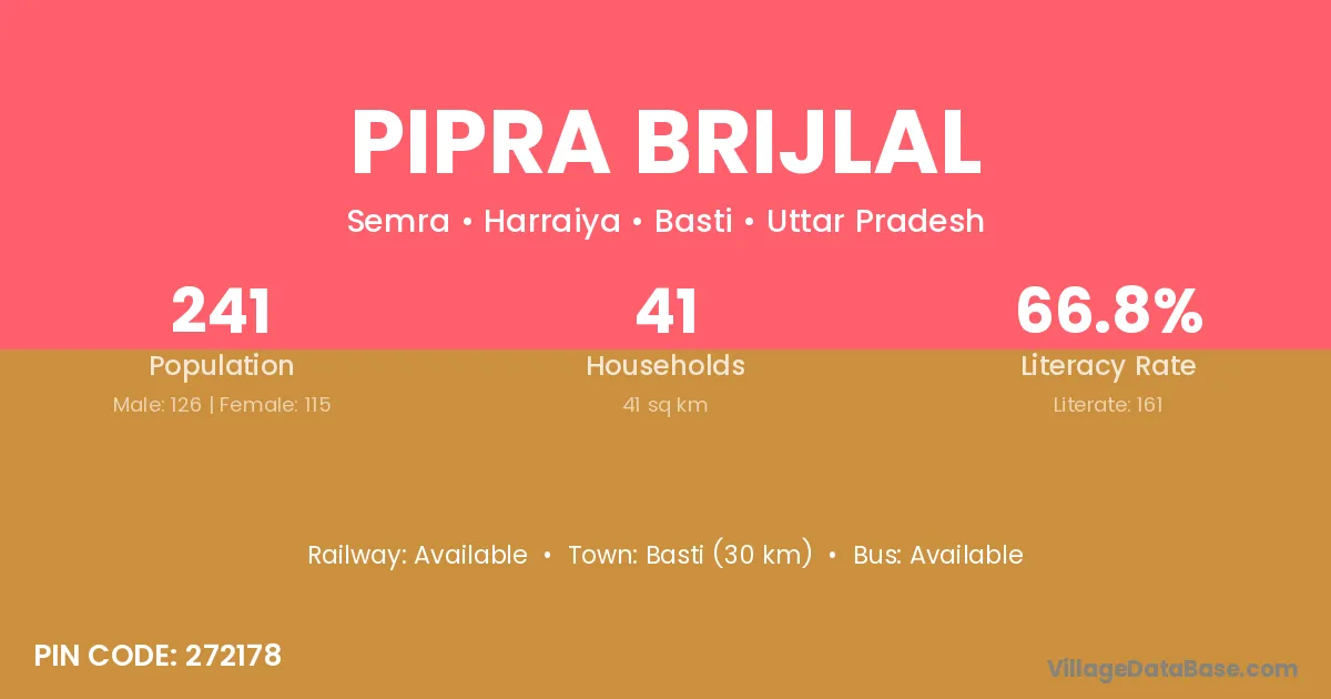 Basti (30 km) is the nearest town to Pipra Brijlal village for major economic activities and is located approximately 30 km away.