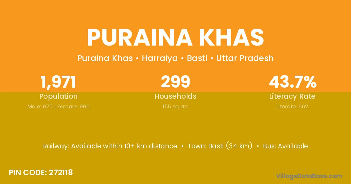 Basti (34 km) is the nearest town to Puraina Khas village for major economic activities and is located approximately 34 km away.