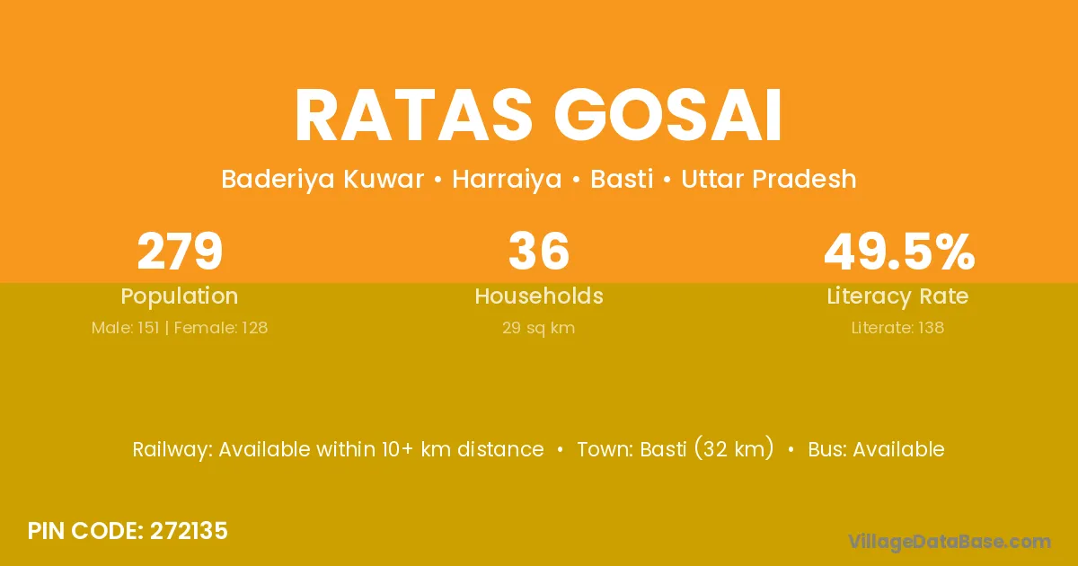 Basti (32 km) is the nearest town to Ratas Gosai village for major economic activities and is located approximately 32 km away.