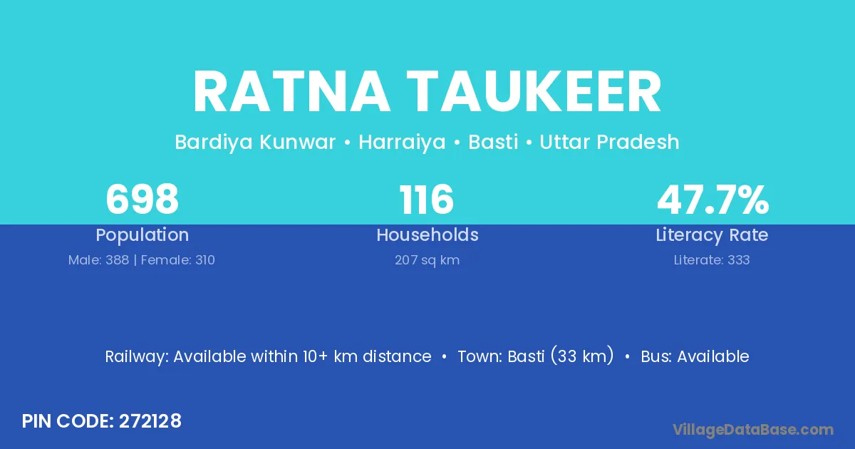 Basti (33 km) is the nearest town to Ratna Taukeer village for major economic activities and is located approximately 33 km away.