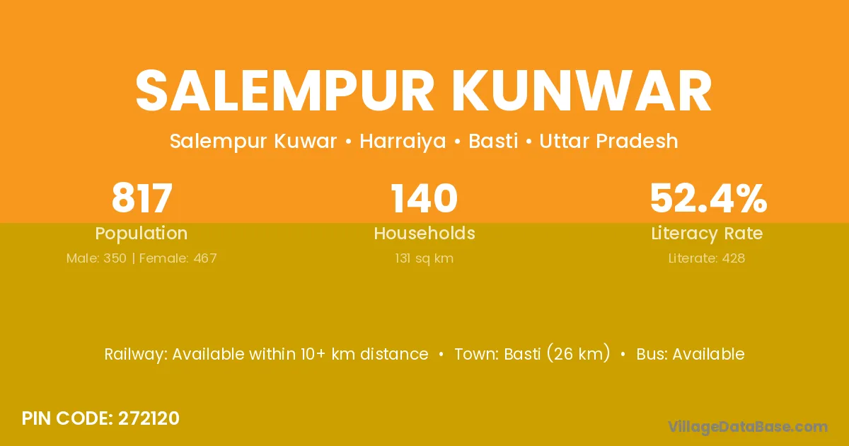 Basti (26 km) is the nearest town to Salempur Kunwar village for major economic activities and is located approximately 26 km away.