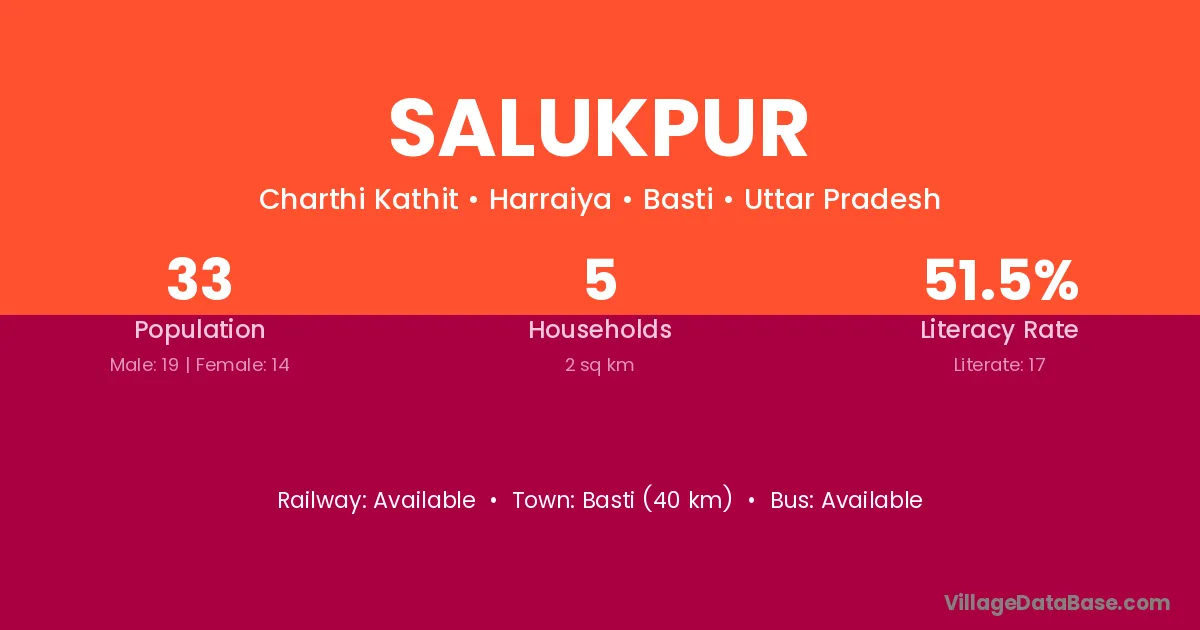 Basti (40 km) is the nearest town to Salukpur village for major economic activities and is located approximately 40 km away.